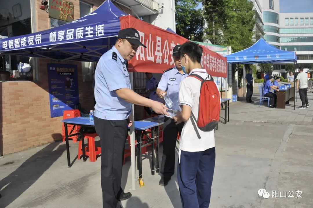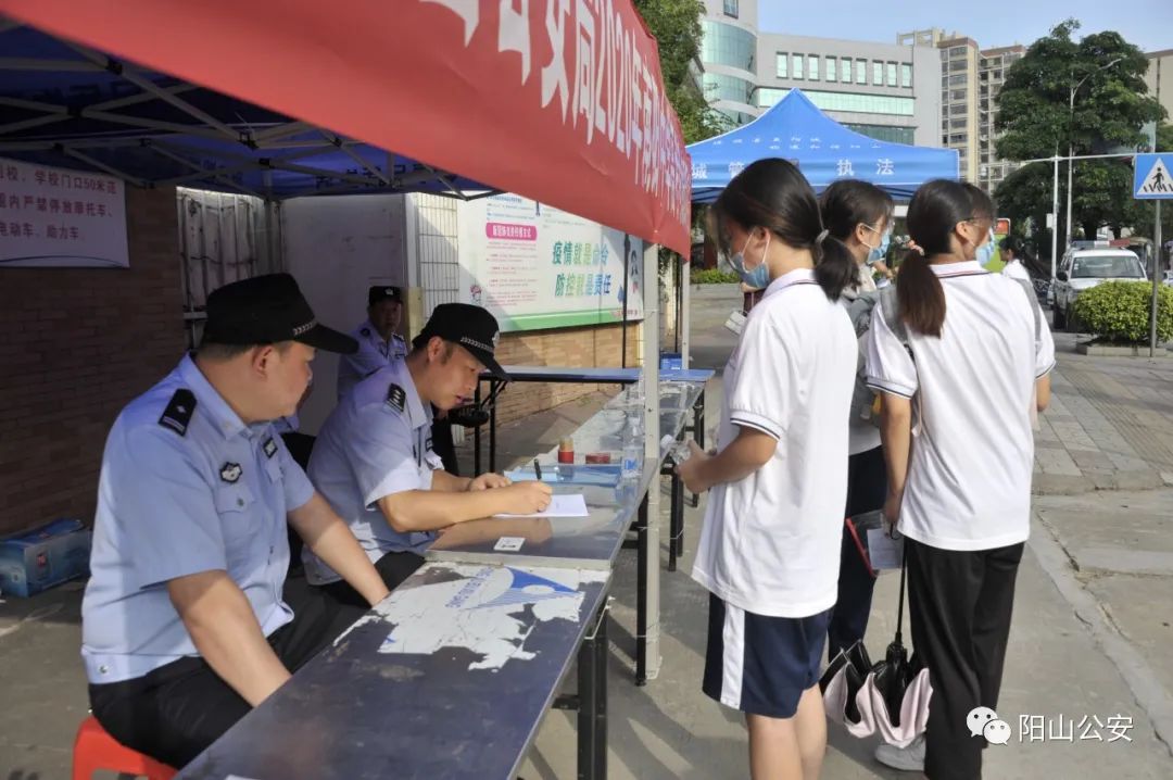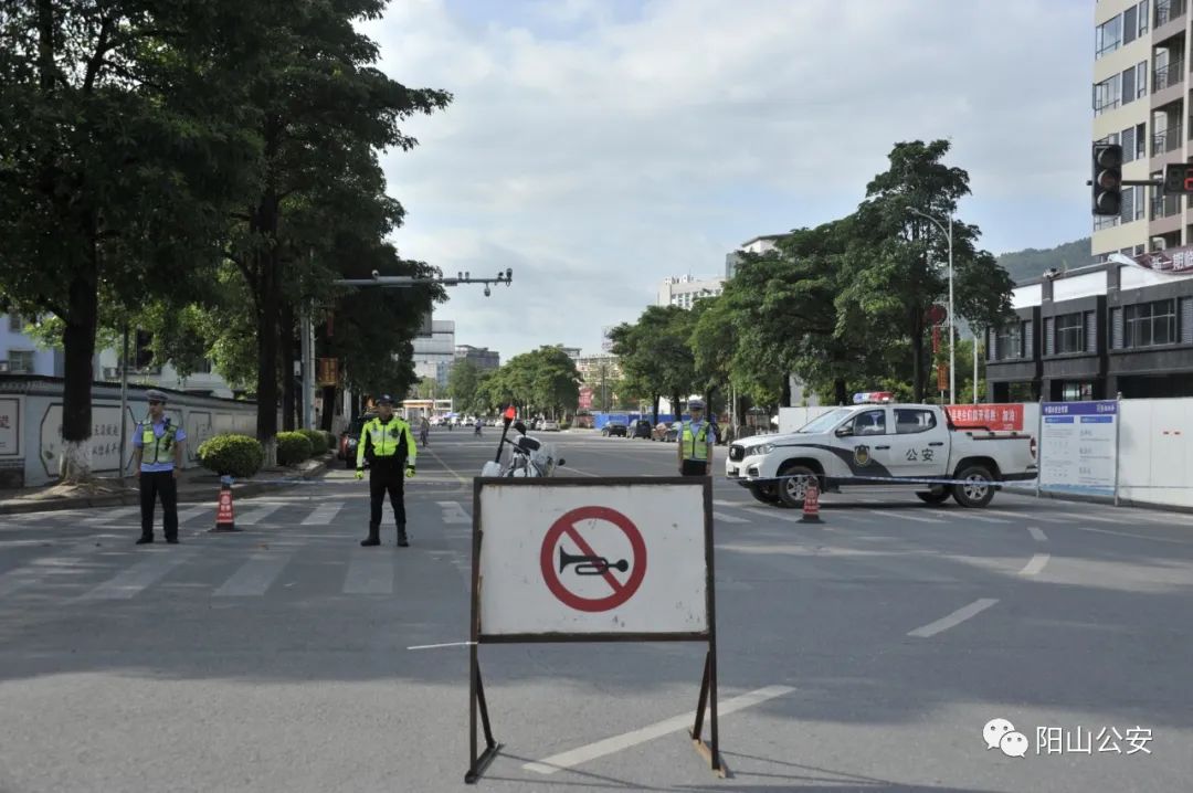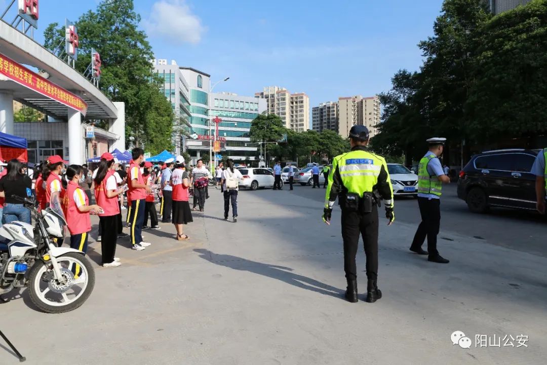 今早,阳山公安交警提前对考点及其周边道路交通状况进行实地勘察,明确责任分工,安排充足警力进行指挥疏导,确保车辆通行安全、停放有序,在主要路口设置车辆绕行、禁止鸣笛等标志标识,切实保障高考期间路面交通畅通安全和规范。
