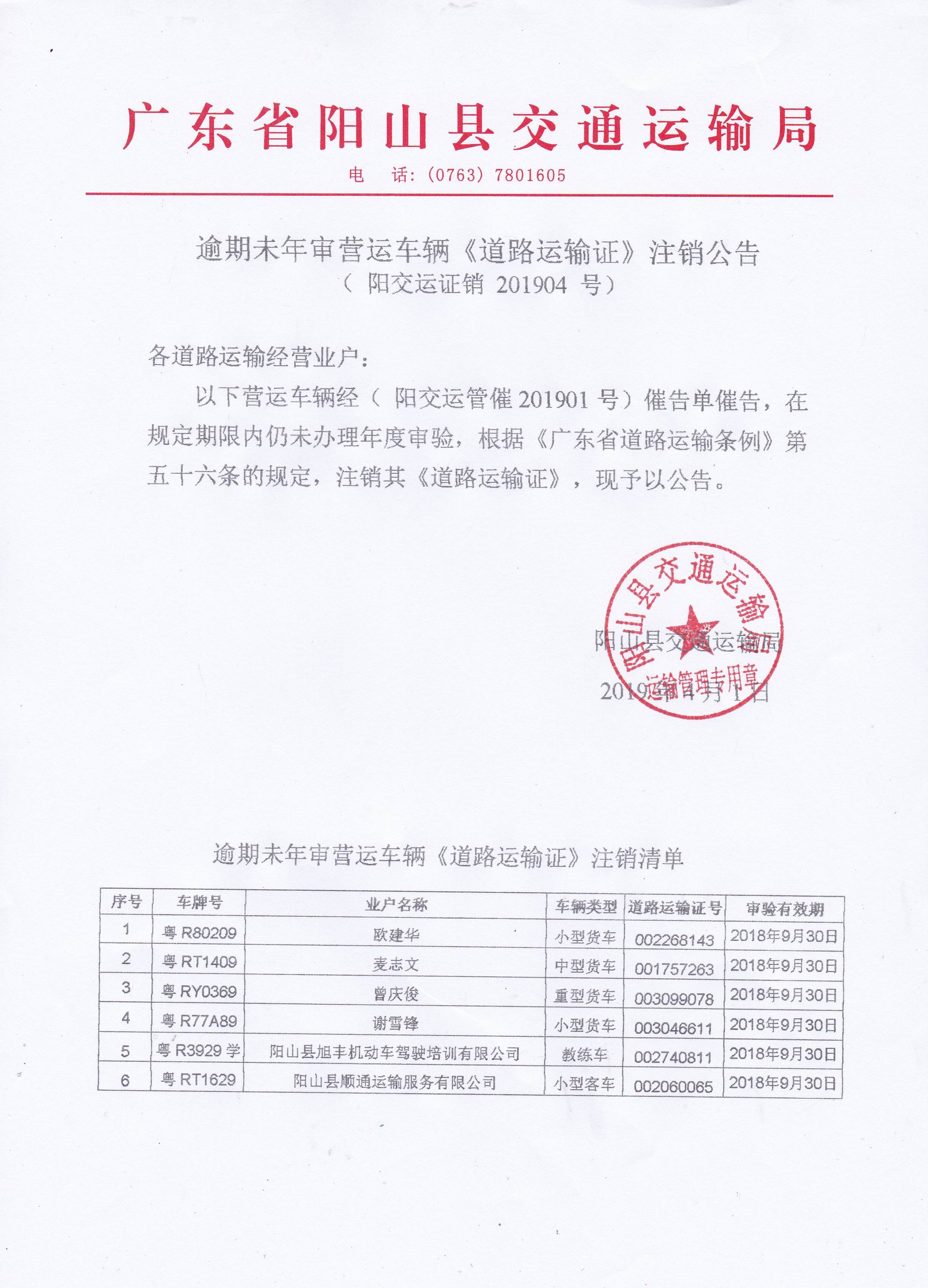 逾期未年审营运车辆《道路运输证》注销公告(阳交运证销201904号)
