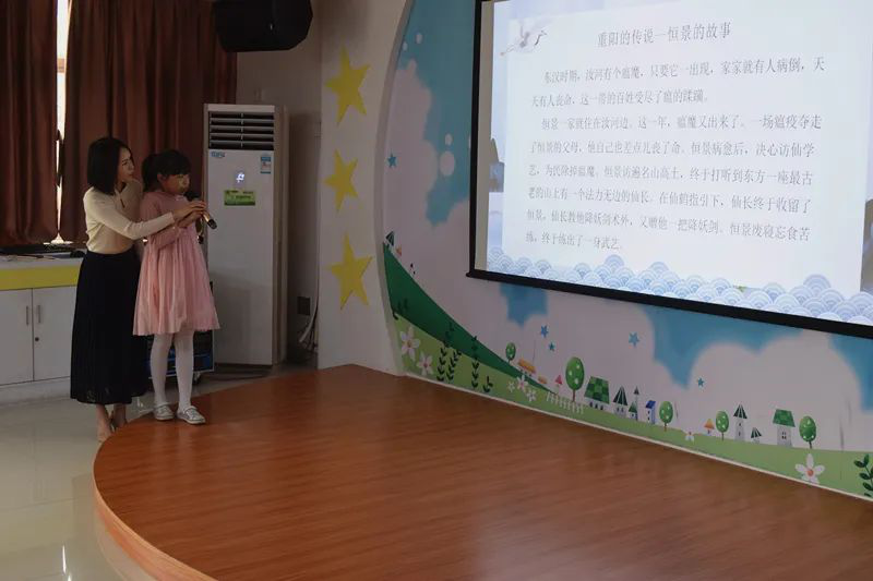 活动由道敏老师主持,她先给大小朋友们讲了一个好听的故事,名叫做重阳节,而且它有一个美丽的传说——恒景的故事,原来重阳节登高的风俗是免灾避祸的活动,而双九又是生命长久、健康长寿的意思,所以重阳节又被叫为老人节。每逢这一天,古人都有登高望远、赏菊饮菊花酒、吃重阳糕等民间习俗 。
