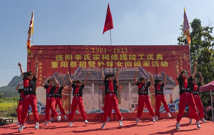 庆典活动现场热闹非凡,礼炮齐鸣、醒狮助兴,激情的锣鼓以铿锵的节奏,威武的狮舞以恢弘的气势,火热的豪情,祝贺连阳李氏宗祠修缮竣工庆典。庆典仪式在嘹亮的国歌声中启动,然后,领导对修缮祠堂做出贡献的宗亲及社会爱心人士进行颁发牌匾。接着是精彩纷呈的庆典文艺汇演,演出首先由外嫁女大合唱《常回家看看》拉开了序幕,随后,瑶族长鼓舞之《军寮团圆鼓》、舞蹈《中国范儿》、雨伞舞《拈花一笑》、独唱《回娘家》《幸福路上》《新的天地》《九月重阳想爹娘》,还有山歌快板剧表演、太极拳、原生态瑶族民间展演等节目连续上演,演出在兴高采烈的笑声、掌声和欢呼声中落幕。庆典仪式结束后,李氏宗亲及外嫁女们一同共进充满温馨的家庭宴会。