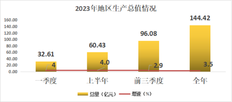 根据地区生产总值统一核算结果,全年我县实现地区生产总值144.42亿元,增长3.5%,增幅比前三季度提高0.6个百分点,比上年同期提高1.9个百分点,分产业看,第一产业增加值51.38亿元,增长4.2%;第二产业增加值26.38亿元,增长1.3%;第三产业增加值66.66亿元,增长3.7%。三大产业比例:35.6:18.3:46.1。