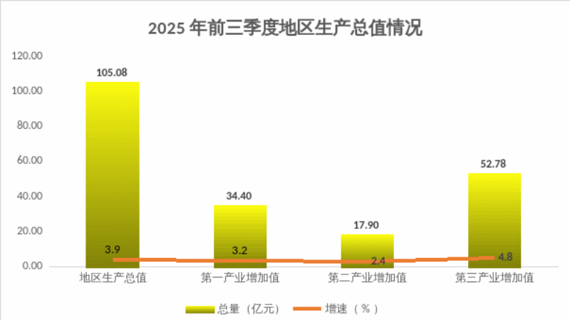 根据清远市地区生产总值统一核算结果,2025年前三季度,阳山地区生产总值105.08亿元,按不变价格计算,同比增长3.9%。其中,第一产业增加值34.4亿元,增长3.2%;第二产业增加值17.9亿元,增长2.4%;第三产业增加值52.78亿元,增长4.8%,三大产业比例:32.7:17:50.2。