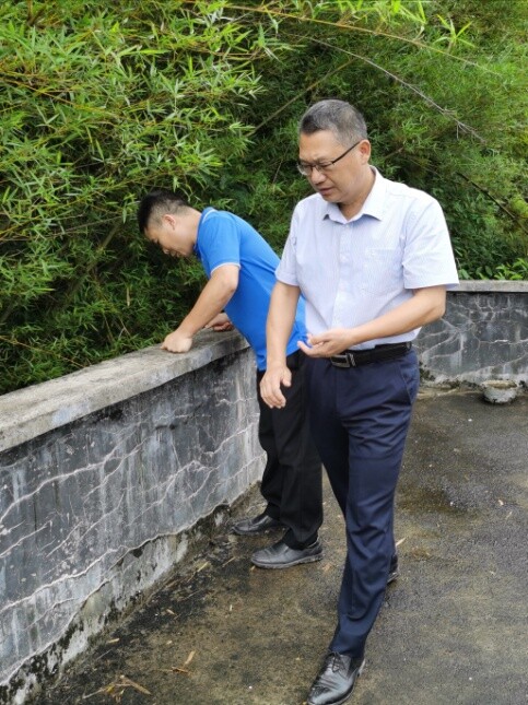 潘文彬一行在太平镇察看了七拱河位于太平镇的龙头岗水文站河水水位情况,实时水位95.10米,25日晚上的强降雨没有导致河水超过警戒水位(96.30米)。随后到白莲湖洞村、太平村委会下坝村两个地质灾害点察看,发现地质灾害点区域的地表泥土因强降雨冲刷导致滑落,存在安全风险。