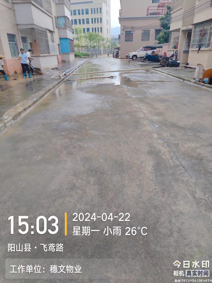 2024年4月22日,洪水退后,公租房小区公共区域立即开展全面清洗工作。
