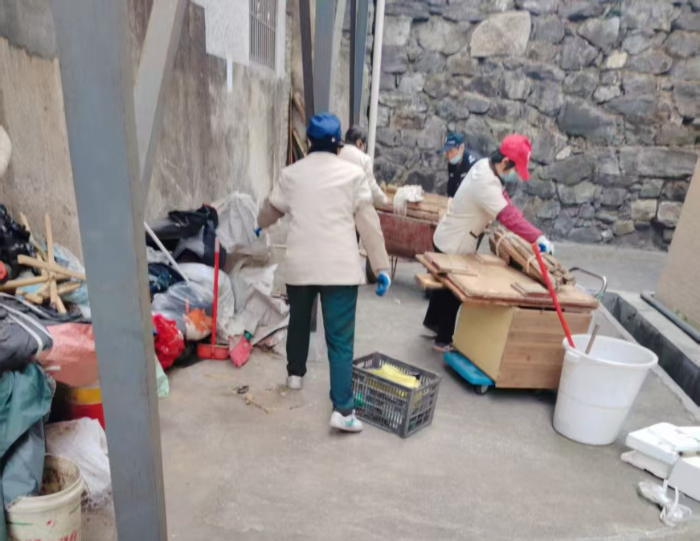 2025年2月28日上午,公租房物业公司组织员工对位于4-6栋旁边堆放的杂物进行清理。