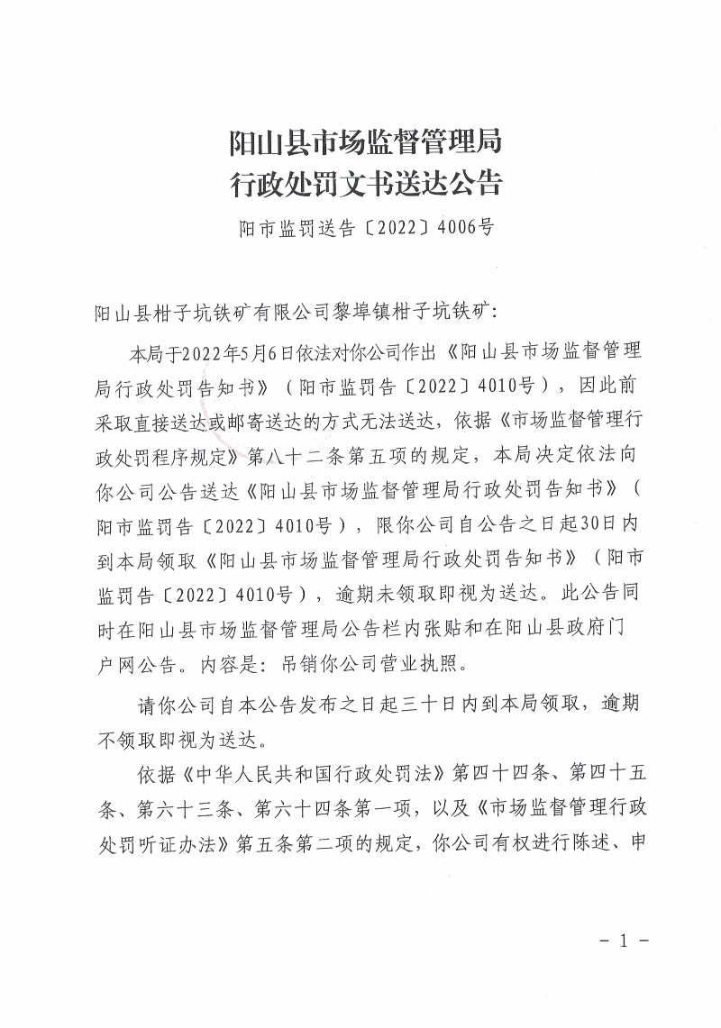 阳山县市场监督管理局行政处罚文书送达公告(阳山县柑子坑铁矿有限公司黎埠镇柑子坑铁矿)