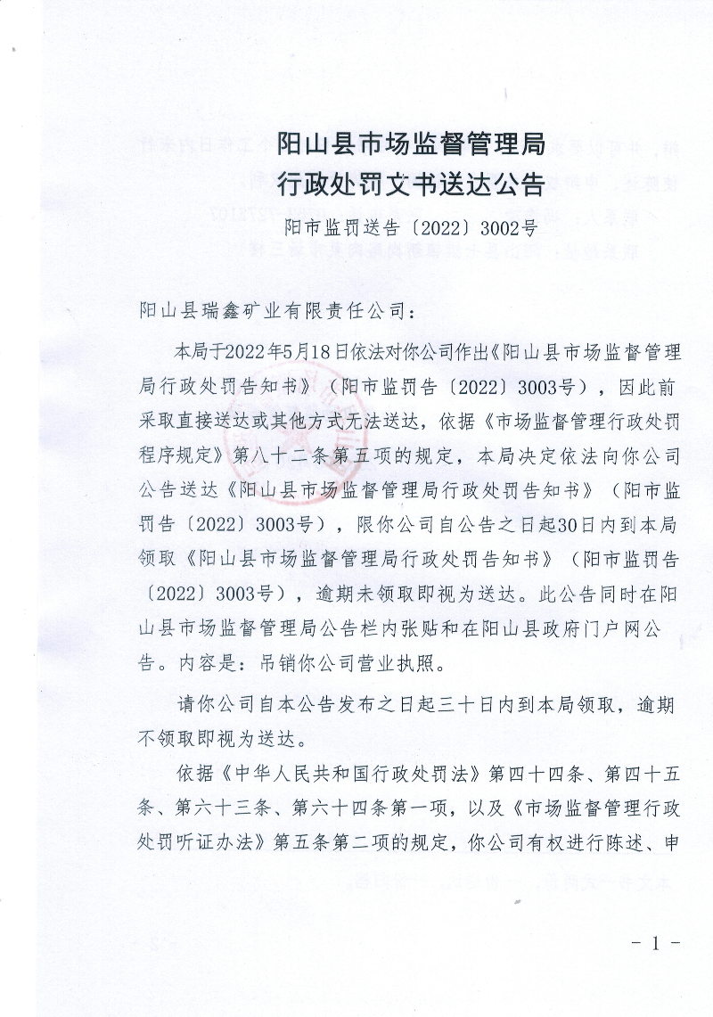 阳山县市场监督管理局行政处罚文书送达公告(阳山县瑞鑫矿业有限责任公司)