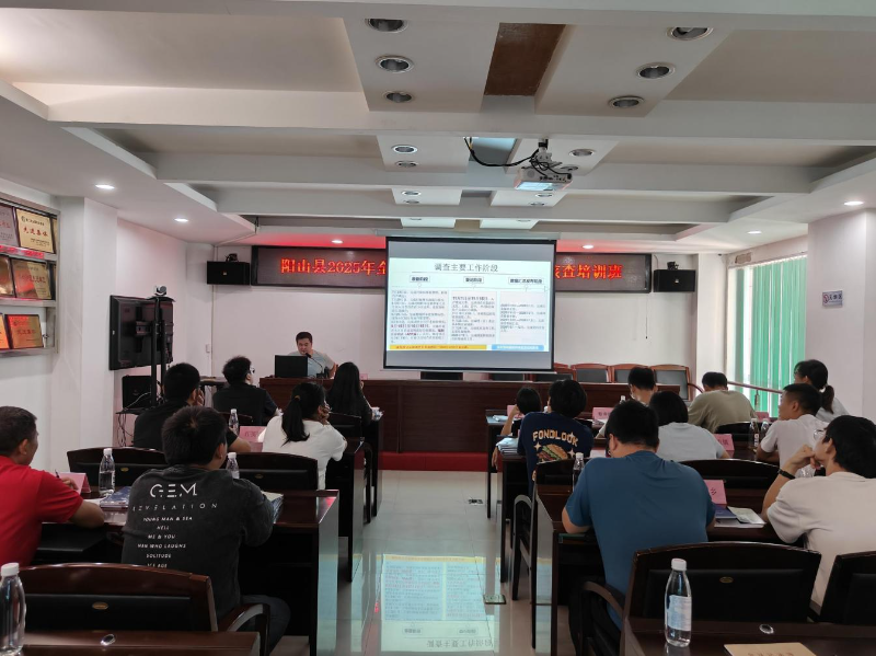 县人调办业务人员就阳山县2025年全国1%人口抽样调查工作“两员”选聘、培训和管理,住房抽样框整理工作细则,数据采集APP操作,模拟演练及答疑等方面进行系统讲解,并一一解答参训人员提出的问题。最后全员以小测试合格的成绩圆满完成培训。
