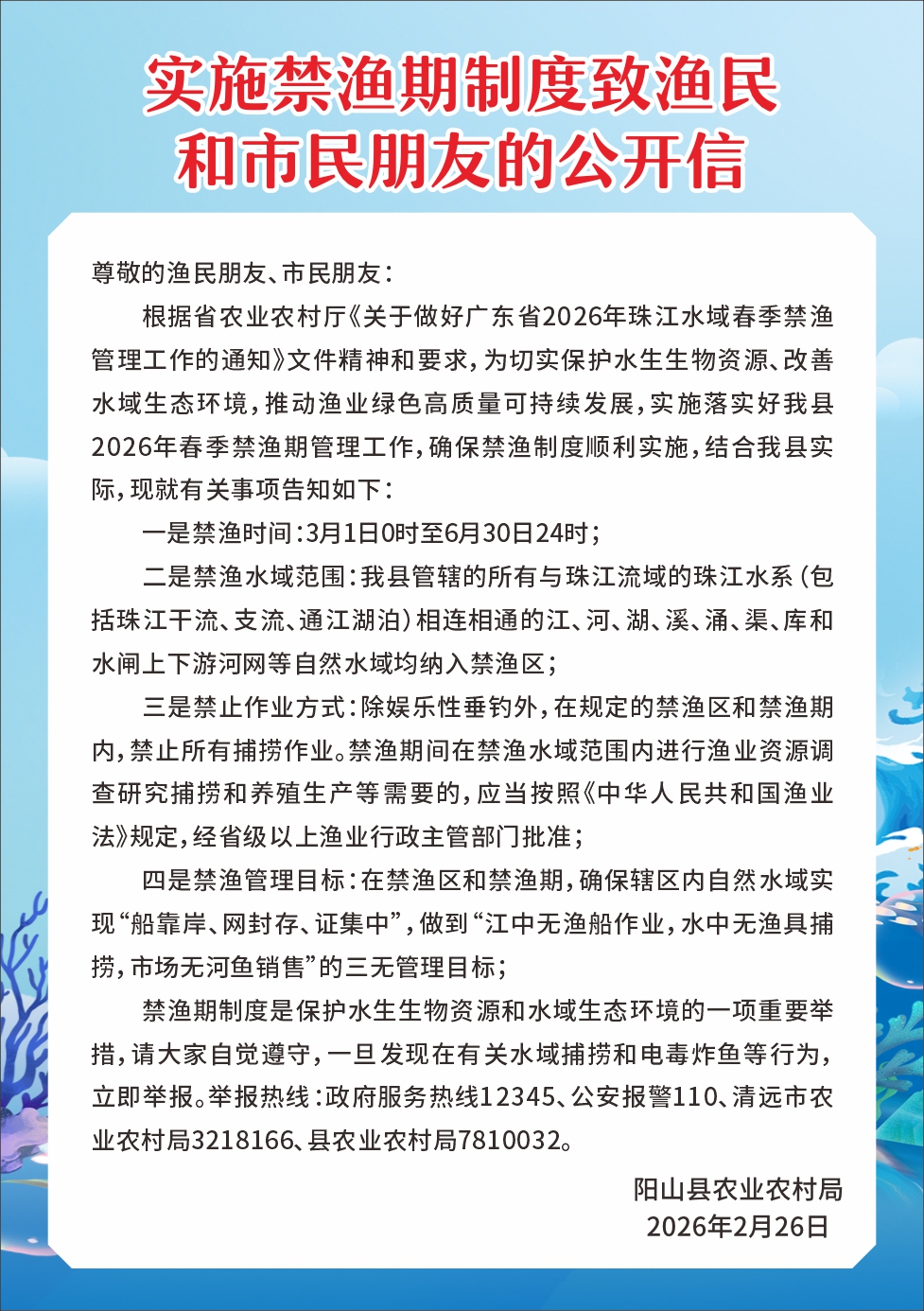 实施禁渔期制度致渔民和市民朋友的公开信