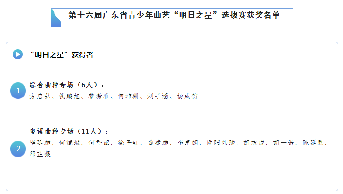 广东省青少年曲艺“明日之星”选拔赛是由省文联、省曲协共同主办,专门面向省内青少年开办的赛事,目的是为广东曲艺培育一大批新秀,成为广东曲艺传承发展的摇篮。自2006年开始,每年一届的素有广东曲艺“小牡丹奖”之称的“明日之星”选拔赛,迄今已成功举办十六届,共产生了逾200位少年曲艺“明日之星”,历届“明日之星”获得者中有部分人已进入专业演出团体从事曲艺工作,不少人在全国全省性大赛中获得大奖。