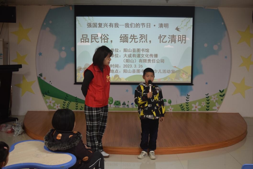 为更好地传承中华传统优秀文化,让广大群众了解清明节的历史来源和文化内涵,由阳山县图书馆主办,大成有道文化传播(阳山)有限责任公司承办的【我们的节日·清明】“品民俗,缅先烈,忆清明”主题活动,于2023年3月26日上午10:00,在图书馆二楼青少儿活动室举行。