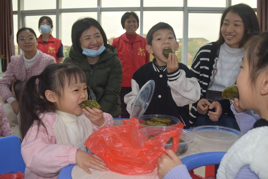 小朋友和家长们拿起手中艾糍品尝了起来,艾草独特的气息和艾糍的软糯不禁让人想一口接一口。艾糍的表皮酥脆,色泽翠绿,内馅花生的香味和砂糖的甜糅合在一起,口感甘中带甜,好像走进了细雨过后的春日草原。