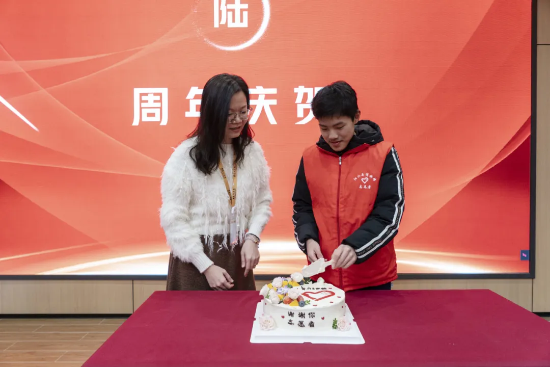 大会临近尾声,一场别具温情的“周年庆贺”仪式温馨上演。在主持人邀请下,梁副馆长与志愿者代表宋宇泽一同移步至精心准备的周年主题蛋糕前。在全场热烈的掌声与悠扬温馨的乐曲环绕中,他们共同执刀,切下象征志愿者服务队成立周年的纪念蛋糕。这一仪式,不仅寓意着团队过去一年的团结协作与成果共享,更寄托了对未来新征程的美好祝愿,为整场表彰大会画上了一个圆满而温暖的句号。
