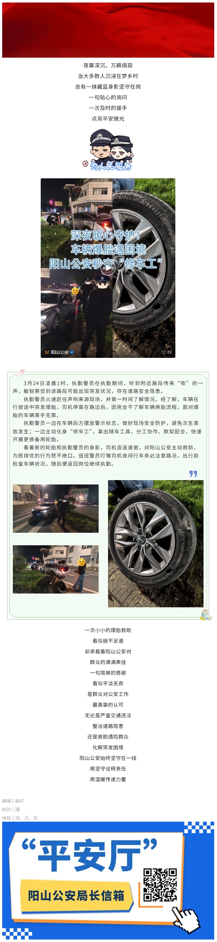 深夜暖心守护!车辆爆胎遇困境,阳山公安秒变“修车工”