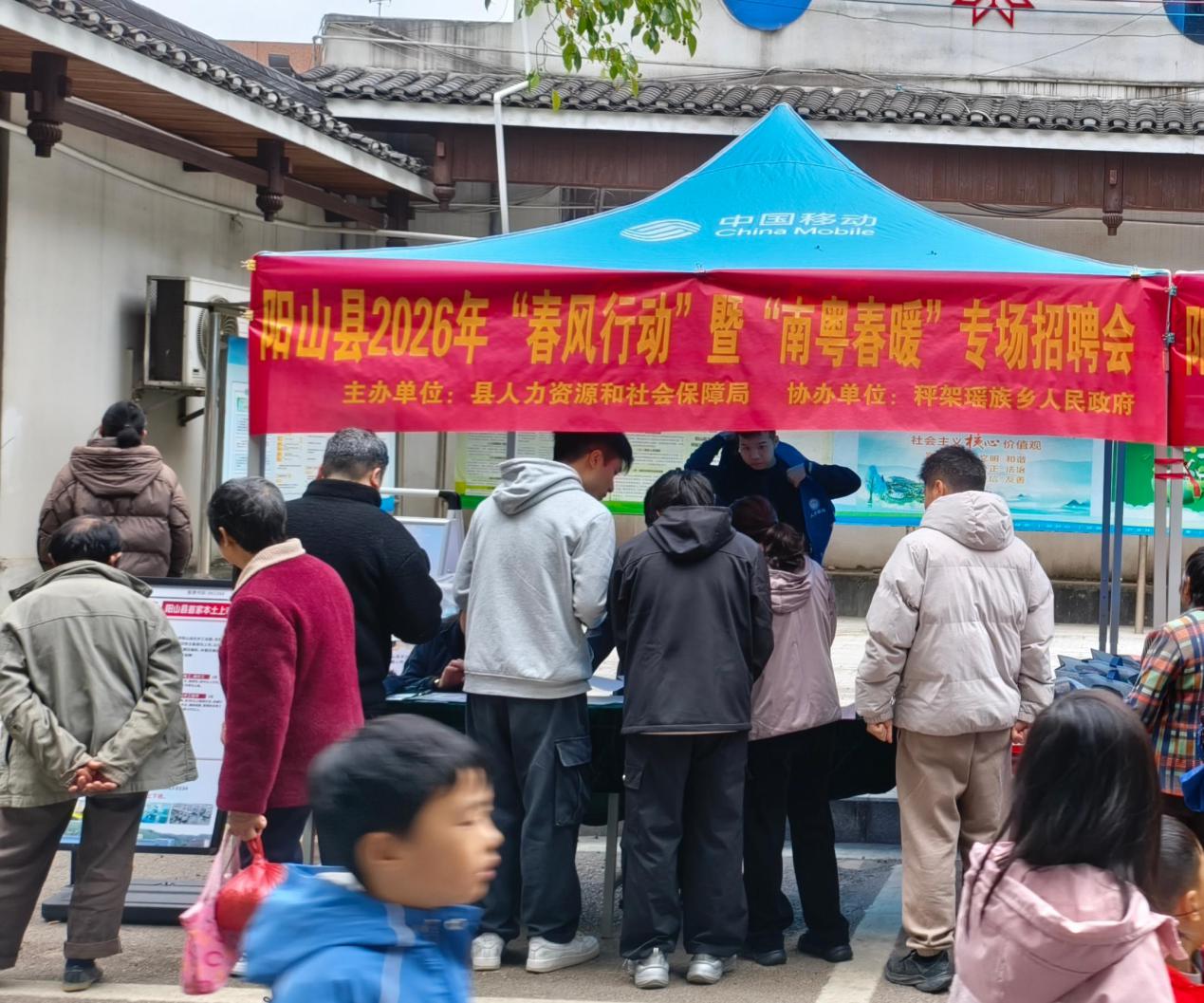 人勤春来早,春风送岗忙。为深入贯彻落实稳就业保民生决策部署,2月5日上午,阳山县人力资源和社会保障局就业中心联合秤架瑶族乡人民政府,在秤架瑶族乡圩镇举办了阳山县2026年“春风行动”暨“南粤春暖”专场招聘会。
